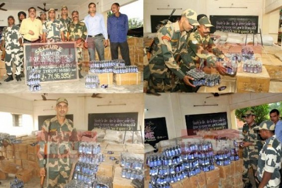 AGARTALA, Oct 27 (TIWN): Tension high at Tripura border areas ahead of Kali Puja, as rampant smuggling of Phensedyl and Corex are much prevalent through border areas. However, leaving no scope for illegal activities BSF seized around Rs. 72 thousands Phensedyl & Eskuf syrups from Nischintapur, near Agartala on Thursday. After a successful raid held by BSF Jawans, it was said that an amount of Rs. 43,000 Phensedyl and Eskuf syrup of Rs. 14,880/- and thus items of totaling Rs. 71, 96, 995 /- were seized by BSF. It was earlier said by BSF 159th Commandant to TIWN that during the Kali Puja, borders will be kept under tight vigilance for 24 X 7 hrs. However, due to the unfencing areas of Tripura borders which are yet 35 % left without sealing have been acting like threats against the safety of the public here. Taking the opportunity smugglers are rampantly doing illegal business throughout the year, although few are nabbed by BSF. On Thursday 2 persons were arrested, although BSF didn’t mention their names yet.