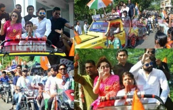 AGARTALA, Nov 15 (TIWN): BJP in its last elections had tried a lot to attract the masses by inviting various stars as Babul Supriyo, Rupa Ganguli like figures and they achieved successfully to gather thousands of public on road where they cheered up by listening Babul Supriyo’s ‘Kahona Peyar Hai Songs’ and to see Rupa Ganguli, but when election result came it was just pathetic. However, inspiring from Mamata Banerjee's policy Tripura Trinamool has invited Sohom Chakraborty and Satabdi Roy (also an MP) and public are just running to see them in rallies, taking photos, selfies, but the main question which remains is how far they will be helpful to increase the vote bank of Trinamool in that mentioned constituency. CPI-M never invites film stars but everytime the party evenafter much corruption, misdeeds--- anyhow comes in power with massive votes, which has however left an example of correctly played political diplomacy. From Airport the guests were received with pomp and gaiety and taking Barjala candidate Prakash Das with Sohom and Satabdi, the TMC kicked off a massive rally from there to Barjala area including Lankamura, Hatimara and other areas.