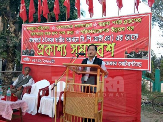 SABROOM, Dec 12 (TIWN): MP Jiten while addressing his concern in an open mass gathering at Manu Bazar Motor stand raised 10 points demands in favour of the welfare of common people of Tripura by CPIM .The main demands were to control price hike ,employment generation to unemployed youths ,setup of BG train service up-to Sabroom and more development as far as more infrastructure etc.