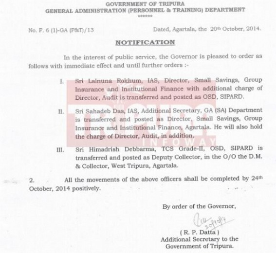 Chief Minister Manik Sarkar & 2014 era Chief Secretary S.K.Panda without any delay demoted and transferred honest & upright IAS official Director of Audit Lalmuna Rokhum to the SIPARD Department in junior level, Sahadeb Das was transferred from the post of Additional Secretary of General Administration. On the other hand the then OSD of SIPARD TCS Officer Himadrish Debbarma was transferred to the post of Deputy Collector in the office of West District Magistrate.