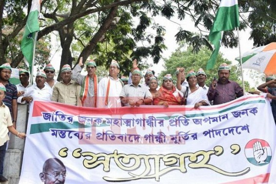 AGARTALA, June 14 (TIWN): On Wednesday Tripura Pradesh Congress led by state Party Chief Birjit Sinha has observed Satyagraha at Agartala to protest against the remark of Amit Shah who called Mahatma Gandhi as a 'Chatur Baniya' during a party meeting at Chattishgarh. However, what Amit Shah had actually said it is yet to know due to various politics in media fueled by NDTV like organizations. The remark of Amit Shah was, "The foundation of Indian Congress had not constituted following any ideology of a single person, neither it was followed by anyone's decision. Some British had formed a club-type of Association, which was gradually converted into a freedom fighters Association. In that organization, there were various viewers including Left Front. Maulana Ji, Madan Mohan Malaviya.....many people were included in the mission, Samajbadi, Communist..... this was not a single decision of Congress-party". "To achieve the freedom various kinds of personalities with different views entered in Congress and became a part of Indian freedom fight", said Amit Shah that snatched the credit of Congress 'alone' in Freedom-movement.
