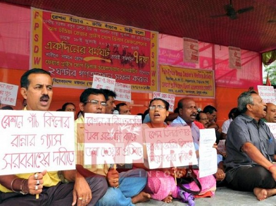 AGARTALA, July 3 (TIWN): In demand of certain issues and Modi Govt's recently launched rules for ration shop dealers, Tripura left front backed ration shop dealers staged protests at Astabol Stadium.