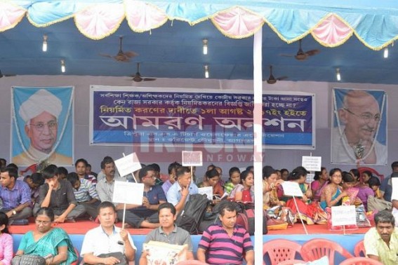 AGARTALA, Aug 1 (TIWN): With a massive faceloss for Tripura Govt, SSA teachers have sat in hunger strike demanding their regularization-notification on Tuesday. While sitting in hunger strike the teachers said that they are ready to die for their demands. The main question they raised was, why instead of showing them regular to the central govt, the notification has not been released officially to the teachers ? A huge number of hunger strikers have sat in strike demanding for their rights. Addressing the press meet, the teachers informed that SSA teachers have already been regularized whereas the notification kept hidden by Tripura Finance Dept, with its ill motive of drawing regular salary of the teachers from centre. However, with valid documents SSA teachers disclosed that they have been regularized in 2015 already and that was accepted by the finance minister Bhanulal Saha when central govt asked the state govt to give details about regular paid salaries.