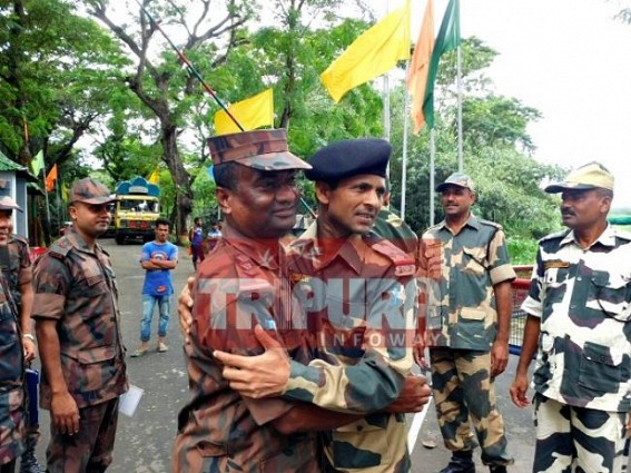 AGARTALA, Oct 19 (TIWN): Border Security Force (BSF), stationed along the India-Bangladesh border at Akhaura check post distributed sweets among Bangladeshi border guards as a goodwill gesture to mark the occasion of Diwali on Thursday.