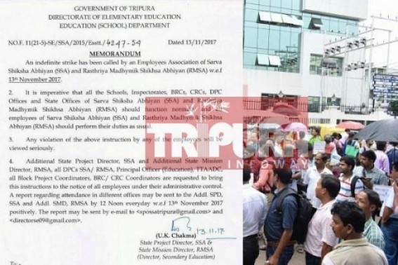 In a letter SSA State Project Director U C Chakma said, "It is imperative that all schools, directors, Inspectorates, BRCs, CRCs, DPC Offices and State Offices of SSA should function normally and all the employees, of SSA and RMSA should perform their duties as usual".