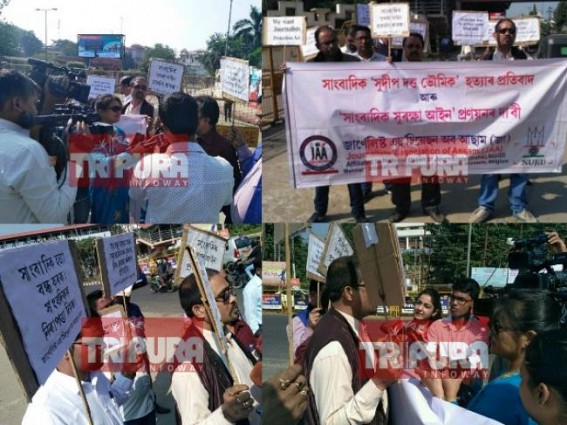 AGARTALA, Nov 24 (TIWN): Outrages against Tripura journalist’s murder have been continuing across Northeast states and also in others states of India. On Friday, journalists of Assam under ‘Journalists Association of Assam’ held a protest rally, walked towards secretariat demanding safety, security of the journalists from Assam Govt. Assam journalists agitated, ‘Every months, here and there the journalist are killed, whereas no proper investigation could be done in any of those cases. Tripura witnessed barbaric killing of TV journalist Santanu Bhaumik on Sep 20. When Tripura couldn’t come out of the shocks then another senior journalist Subir Datta Bhaumik was killed by state rifles, just because he exposed the corruption of TSR Commandant". The journalists association demanded implementation of 'Journalist Protection Act', for the sake of journalists' security.