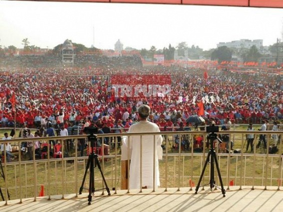 AGARTALA, Nov 26 (TIWN): Tripura CPI-M’s Melarmath honchos not leaving any stone unturned to scare BJP’s political base as over fifty thousand villagers, motor unions cadres were mobilized all across Tripura to fill Astabal Maidan. Lots of hapless women, MGNREGA workers, unemployed youths were threatened to join CPI-M rally. Plan wise the city was blocked in every ways by dividing the rally into various small parts and throughout the town CPI-M led rallies walked into various small-small parts, paralyzing the whole city's movements. More irritating issue came out when Astabol field was blank in some parts, the comrades occupied the main road with red-brigade and thus the way from North Gate was fully paralyzed during the hours of CPI-M rally, halting movements of public including hospital goers and Airport goers. Amidst Tripura's Nil-Industrialization's allegation, Chief Minister Manik Sarkar during the rally claimed that Tripura has various industries and lakhs of people are working in various factories.