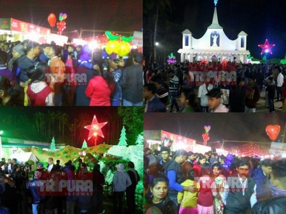 AGARTALA, Dec 25 (TIWN): Lakhs of people thronged across churches, shopping malls in Agartala to celebrate Christmas on Monday. Tripura police left no scope for any disturbances and at every foot-steps police, TSR have been deployed. Big Bazar, City Centre and various other places at the Capital City remained lighted, glittering throughout the evening and night. Mariamnagar church’s crowd was not less than Diwali, Kharchi celebrations. People from all religions thronged to Christmas celebrating zones to become a part of the auspicious occasion. No untoward incident has been informed but unruly traffic rules breakers remained uncontrolled in some places like every year.