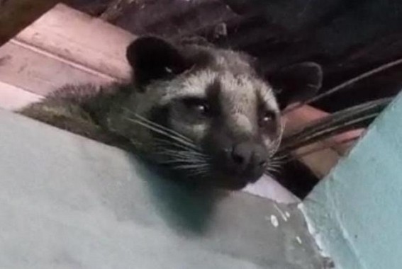According to the forest department the species has been identified as "Asian Plum Civet ". The animal was first spotted by Sadhan Laskar’s family members on Sunday at around 2 Pm, immediately it was informed to the Forest Department and Police. The Forest department rushed to the spot but even after 2 hours passed the Forest department failed to rescue the animal due to lack of ‘Animal Rescue Equipment’.
