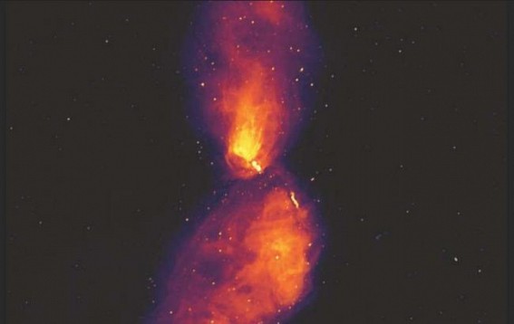 According to astronomers, the image is caused from the black hole feeding on in-falling gas and then ejecting most of the material at near light-speed on either side of the hole, causing "radio bubbles" to grow over "hundreds of millions of years."