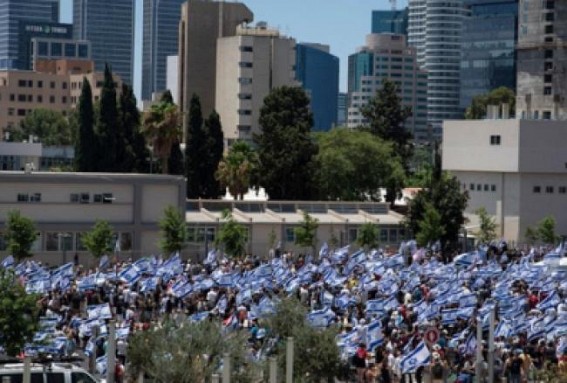 Jerusalem, Sep 12 : Tens of thousands of Israelis shouting "Democracy!" and waving the flags took to the streets across the country ahead of a crucial hearing on Tuesday in the Supreme Court on whether to accept the government's bid to curb its powers.