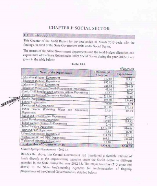 In the page no 1 of 257 paged CAG report below, in the Table No: 1.1.1 the report shows that, as per budget a total of 4,970.55 crores of rupees was allotted to 18 departments under SOCIAL SECTOR category. Among them,leaving the Labour Organisaztion and PGP and TRP department, all the 16 departments failed to expense and utilize the budget allocation. In this report, CAG further raises questions on different works implemented by these departments and indicated the loopholes and remedies which will be brought to the readers shortly. In this report, it is clear that among 4,970.55 cores, only 3,541.91 crores are expensed.